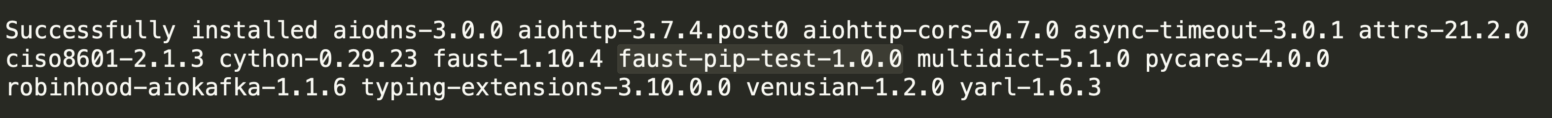 )下面是安装了faust的faust_pip_test包,以及在我的MacBook上安装的附加软件包aiodns、ciso8601和cython。