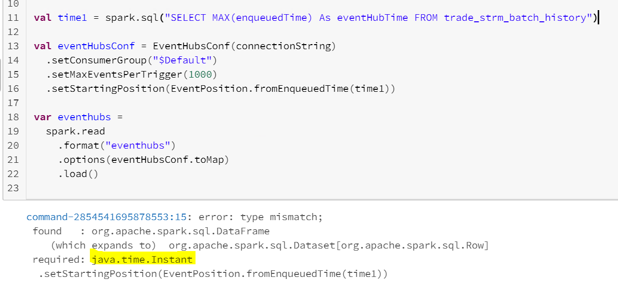 val time1 = spark .sql("...") .as[java.sql.Timestamp] .first() .toInstant