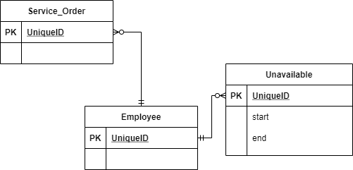 如果员工的时间不与该员工不可用的行重叠,则该员工的可用时间为给定时间。此外,我们还通过向不可用表添加一个约束来防止双重预订,该约束阻止为同一员工及时插入重叠的新行。