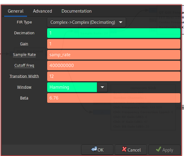 因此,尝试调整您的截止值,使其低于samp_rate,并使您的过渡宽度达到250 e3。我使用GUI滑块来设置我喜欢的过滤器,并且我将在最终版本中使这些过滤器永久化。