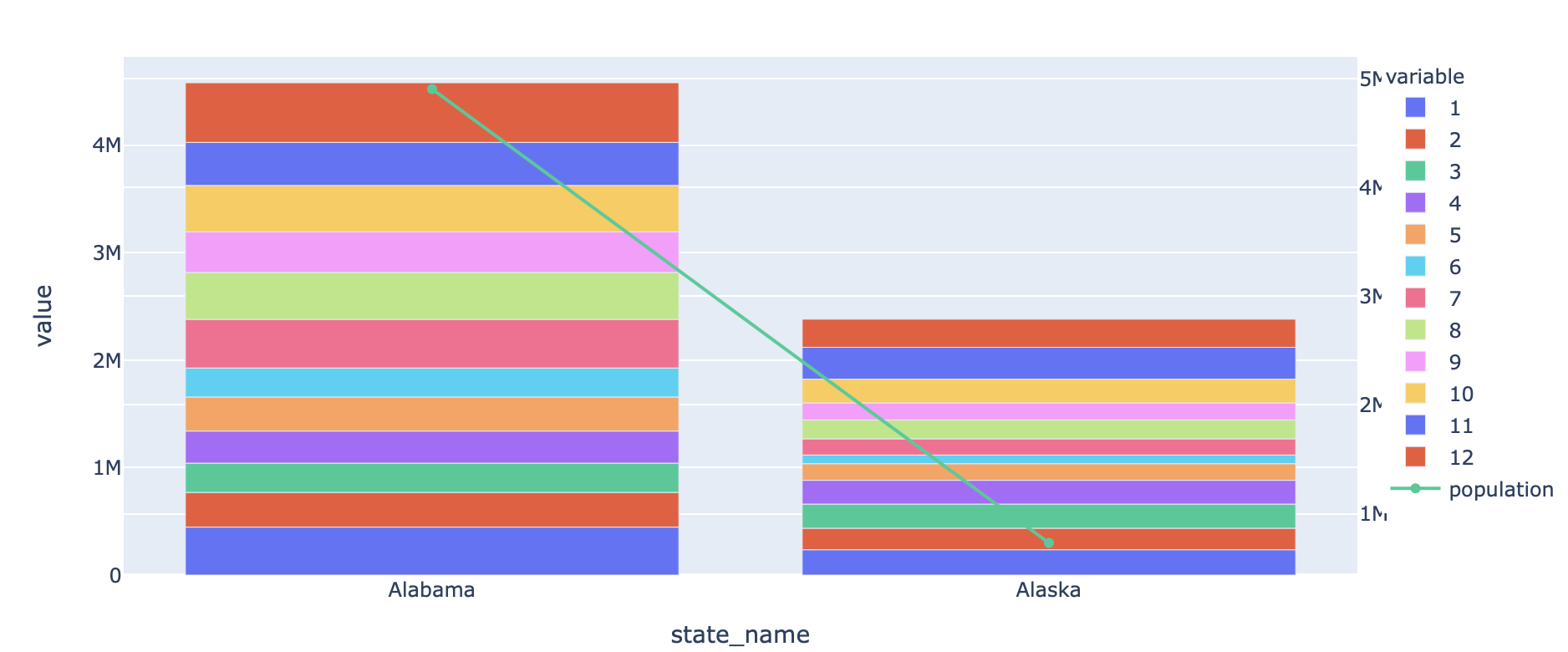 fig = px.bar(df.reset_index(), x="state_name", y=[1, 2, 3, 4, 5, 6, 7, 8, 9, 10, 11, 12])