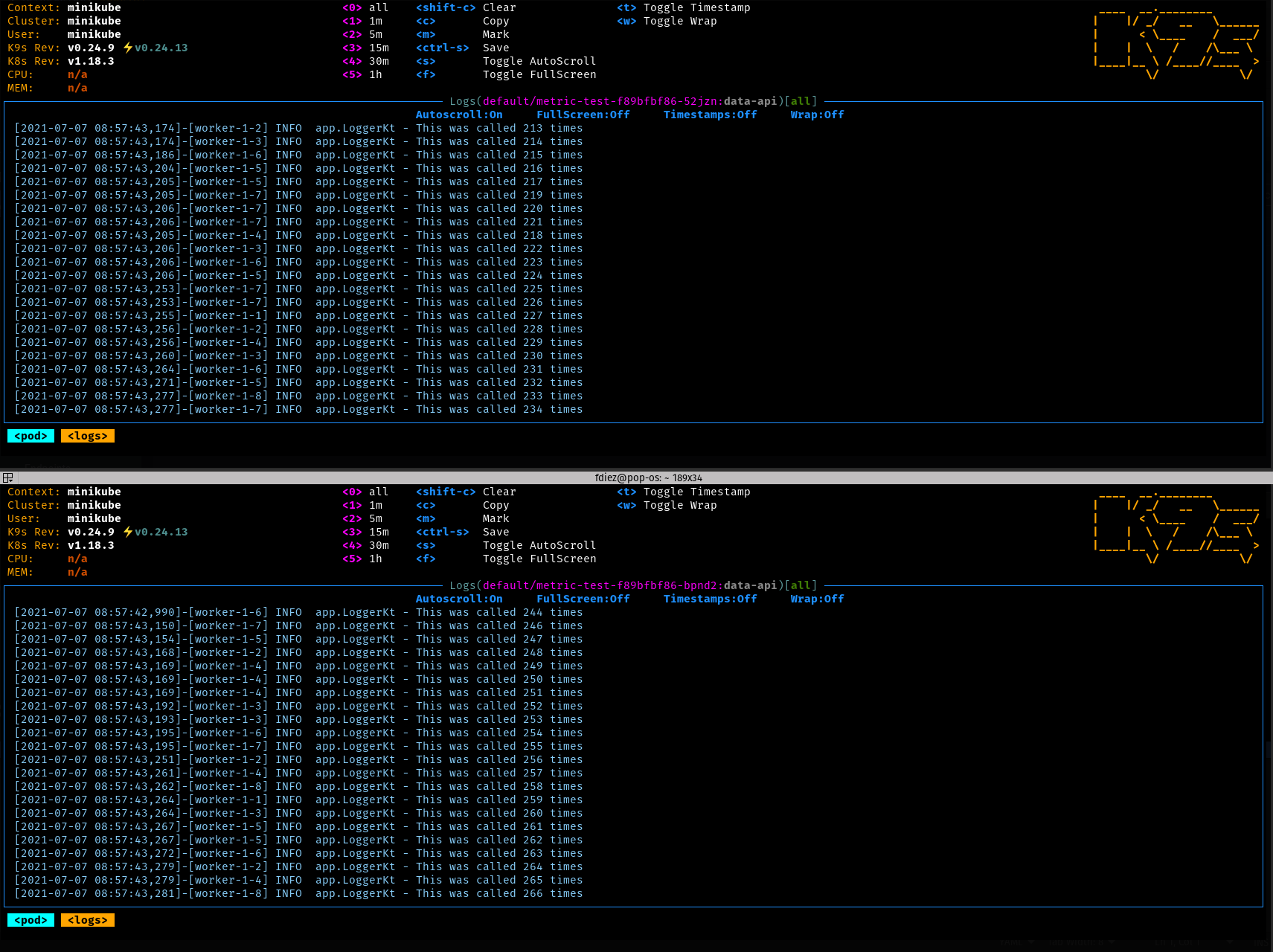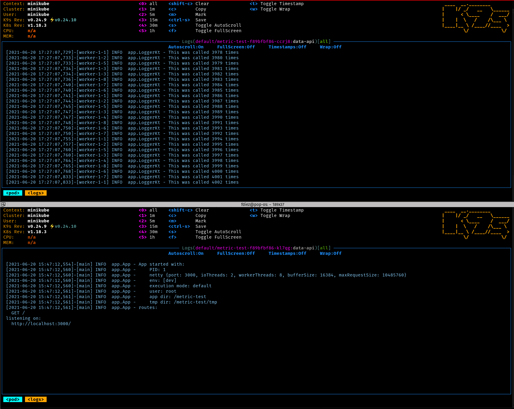 metric-test-f89bfbf86-kl7qg 1/1 Running 0 16h下面是运行curl脚本一段时间后两种日志的图片:
