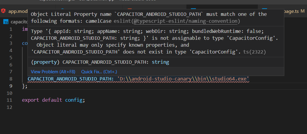 }对于角10,现在对于角12是capacitor.config.ts的capacitor.config.ts扩展,现在我如何实现类似于"windowsAndroidStudioPath": "D:\\android-studio-canary\\bin\\studio64.exe"的东西。