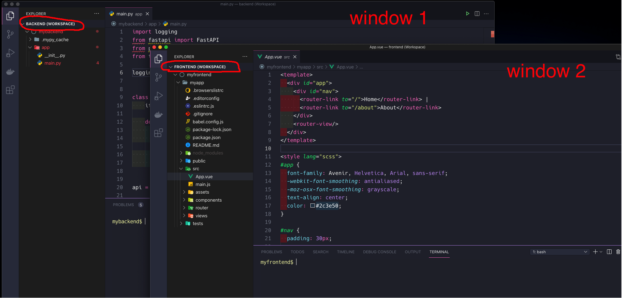它的优点是它允许在前端和后端工作区之间共享扩展、键盘快捷方式和其他设置。例如,您有与Git相关的扩展和设置。使用2个安装程序,每次发生更改时都必须跟踪和同步这些公共设置。只有一个安装+工作区,设置是共享的。