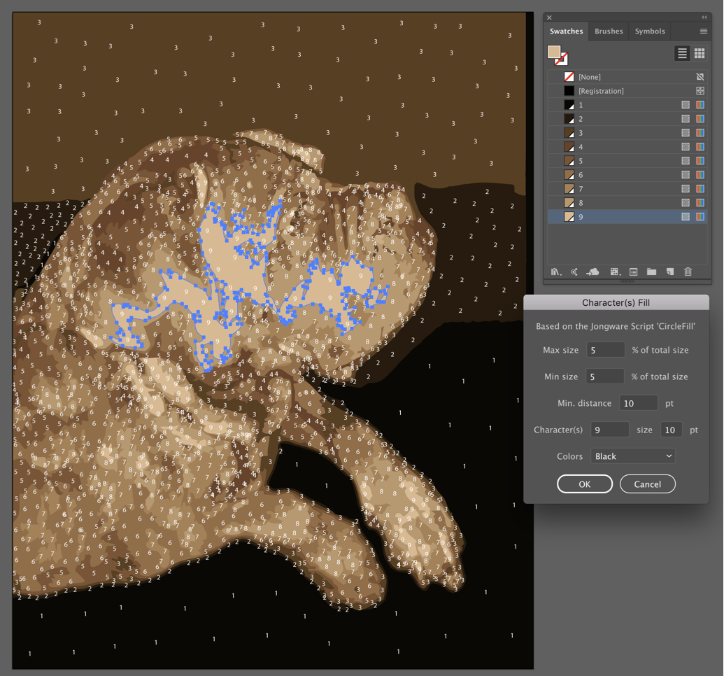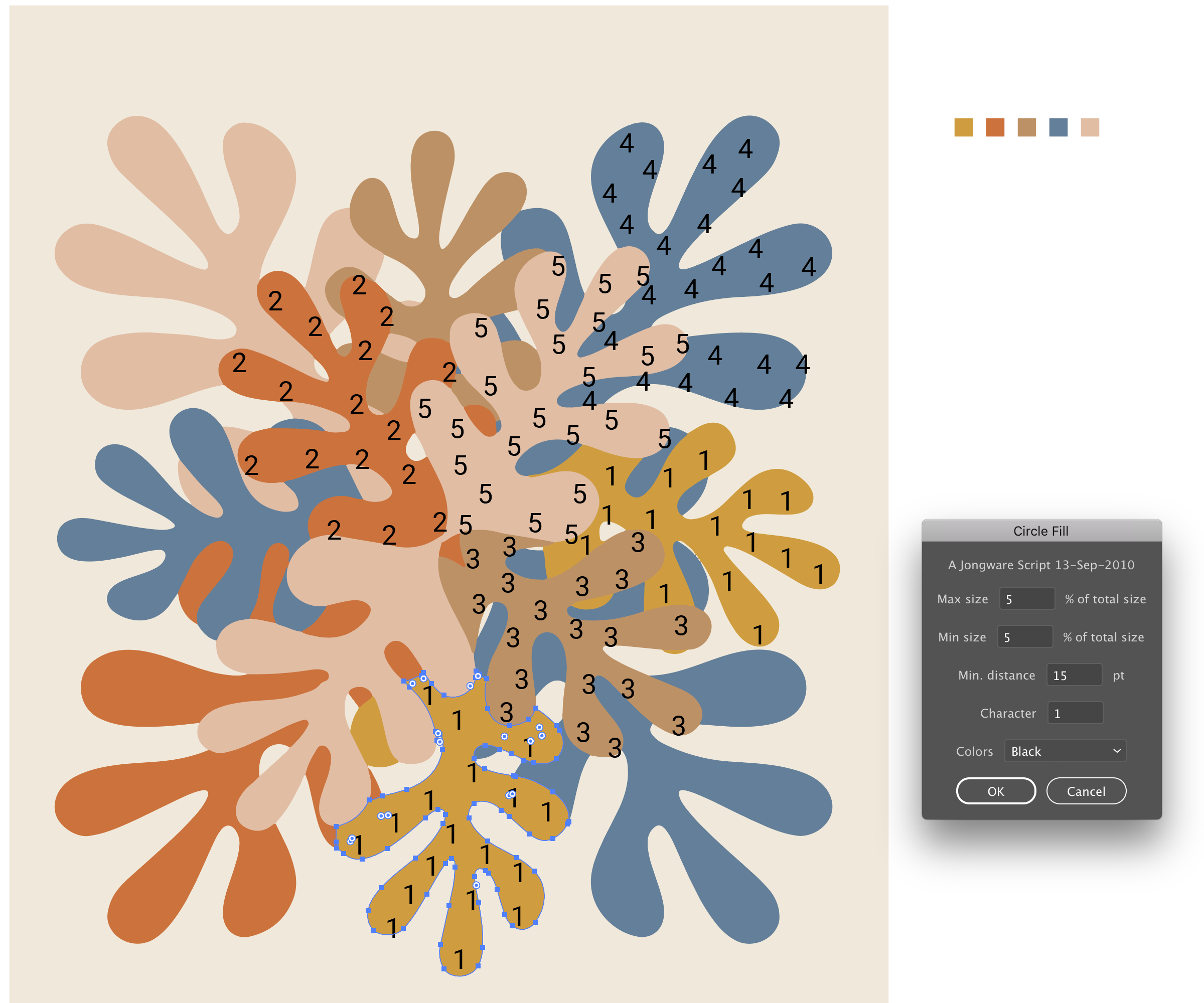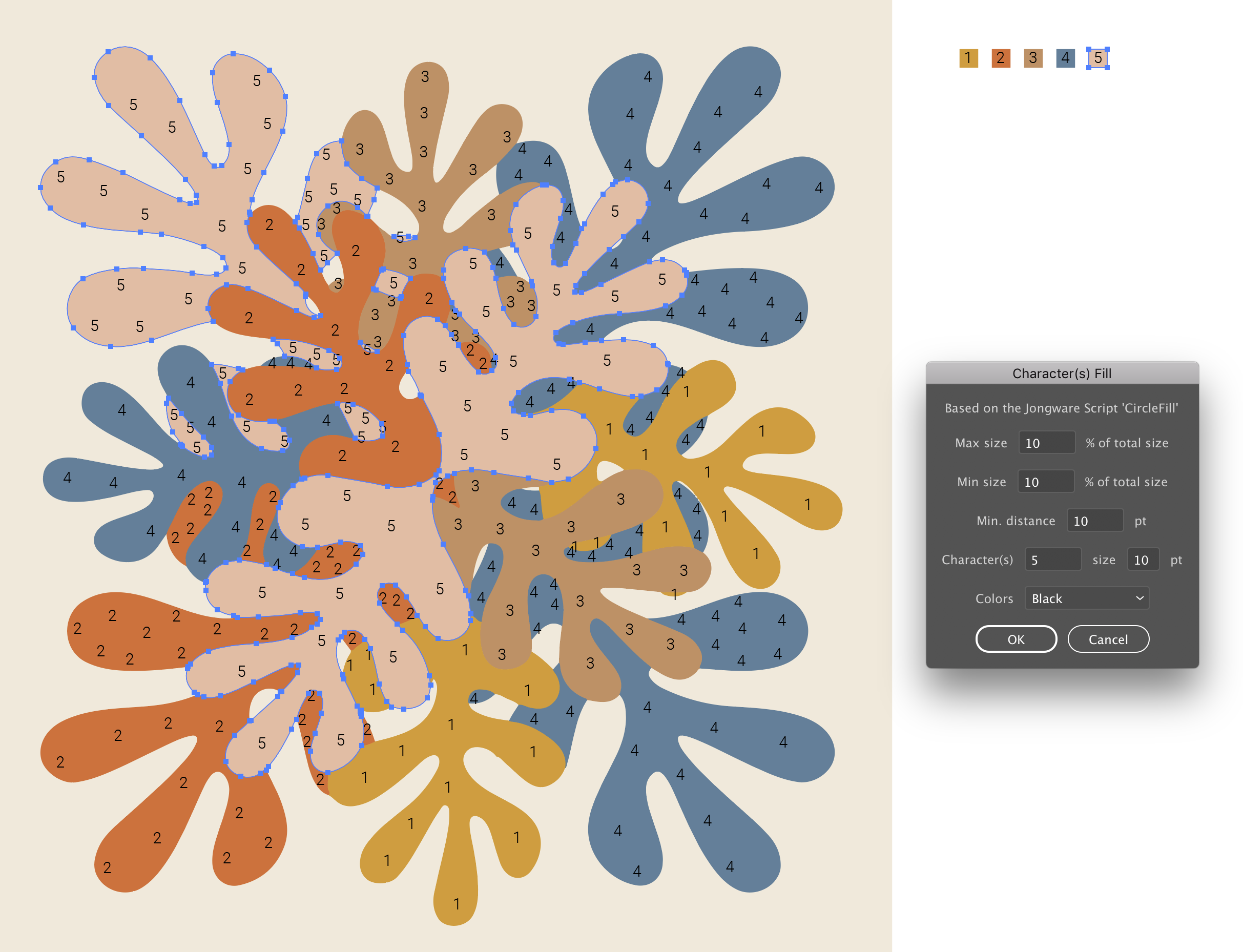 只是为了好玩,我设法修改了老Johnware的脚本(圆圈填充)。现在它可以填充给定的字母(例如数字)。它在一定程度上起作用,但其结果远非理想:
