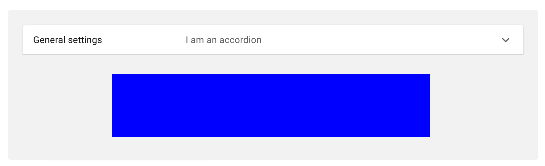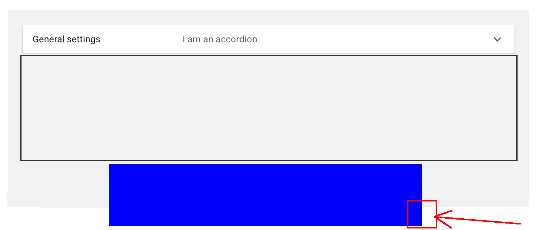 我有一个div容器(灰色),它有一个手风琴组件,只有一个AccordionSummary组件。另一个(蓝色)在那个下面。一切看起来都很好(图1)。当我展开手风琴时: