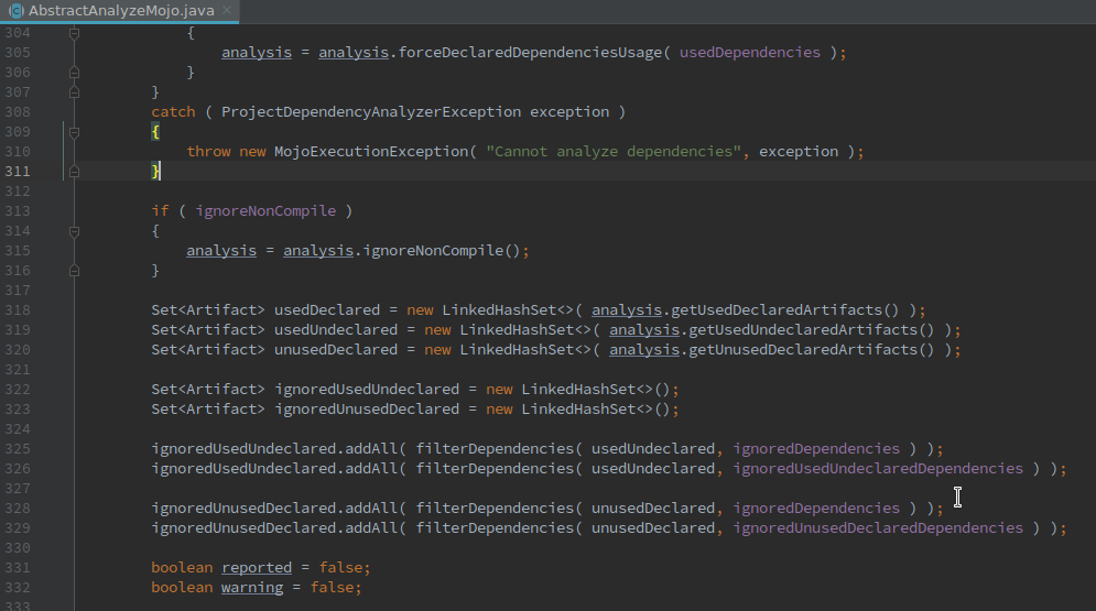 </dependency>传递给testArtifactsWithNonTestScope工件集,因为类org.hamcrest.MatcherAssert仅在测试类中使用。当然,这种行为是不正确的,因为来自hamcrest依赖的其他类都存在于非测试类中--在maven-dependency-plugin中肯定存在缺陷。