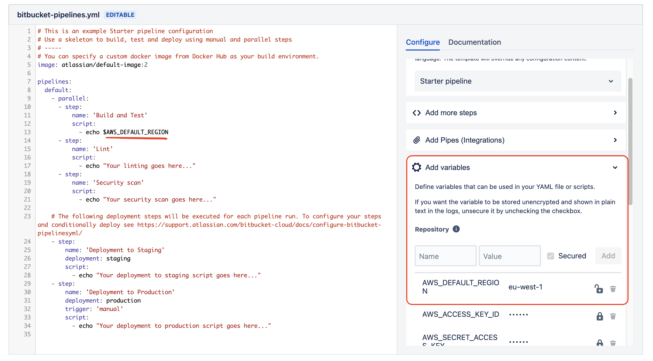 为了在bitbucket管道中使用环境变量,您必须在bitbucket上直接声明它们:在pipeline.yml编辑器中,有一个显式名为"Add变量“的选项。在这里声明你的变量。