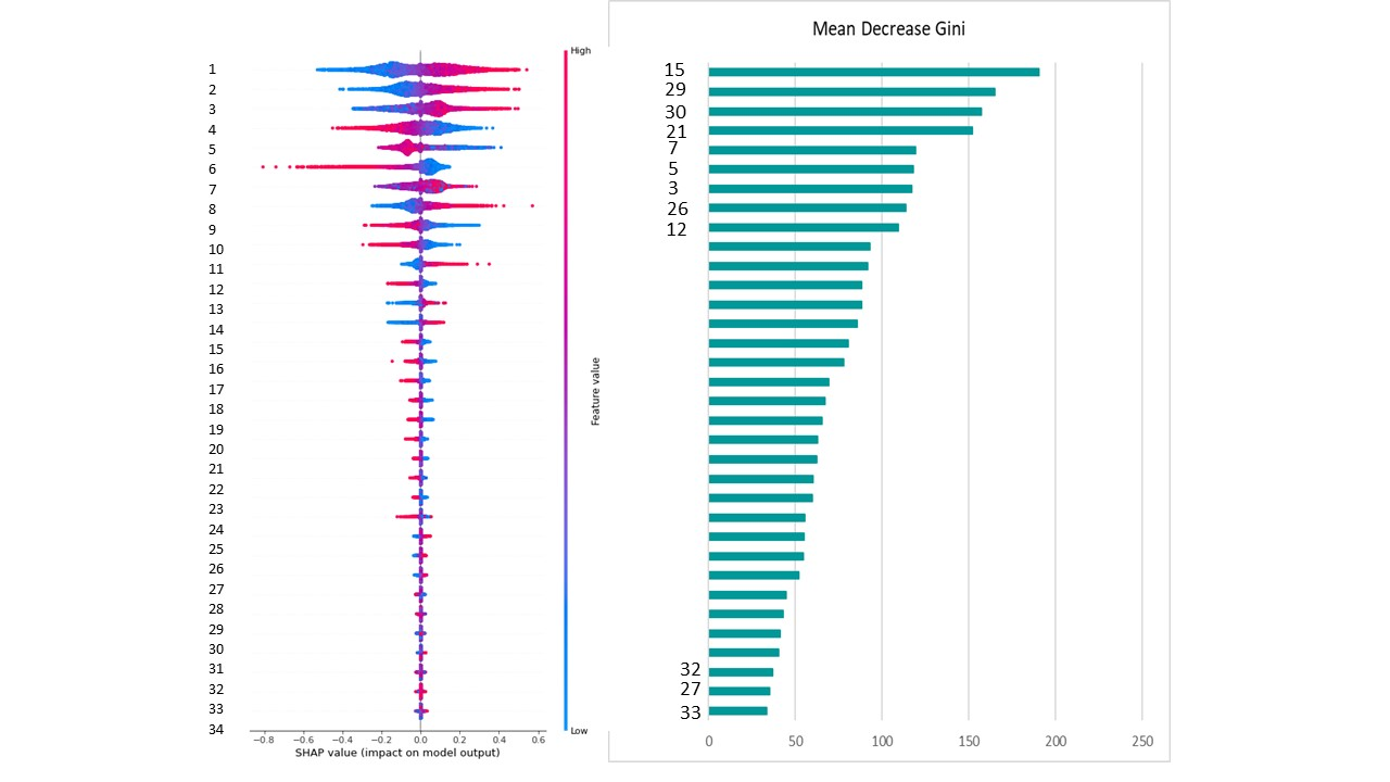 我有一个关于可变重要性排名的问题。我使用34个变量使用相同的数据集建立了MLP和RF模型,并在类似的测试数据集上获得了相同的精度。正如您在下面的图片中所看到的,SHAP摘要图和RF VIM的顶部变量是非常不同的。有趣的是,我从MLP中删除了低排名变量,提高了精度.然而,射频结果并没有改变。这是否意味着RF不是对此数据集建模的好选择?我仍然感到奇怪的是,排名是如此的不同: SHAP摘要图与RF VIM,我给排名最高的变量和低排名的变量编号。