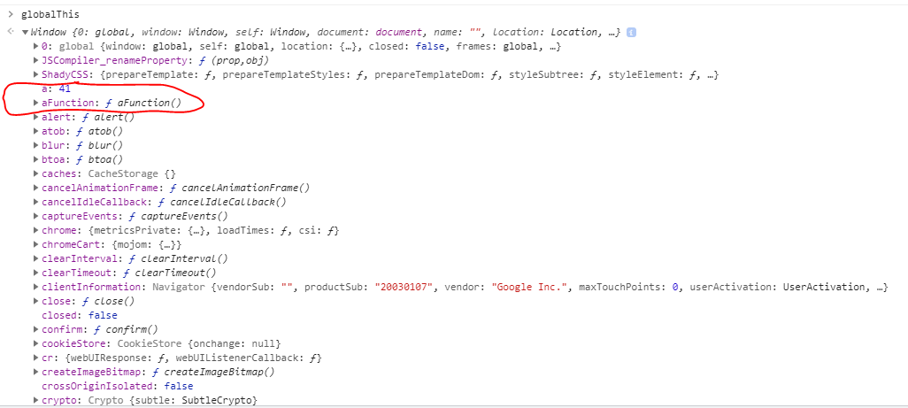 var a = 41;当他们记录globalThis时,他们会发现一些巨大的对象,里面有a,aFunction,但没有class