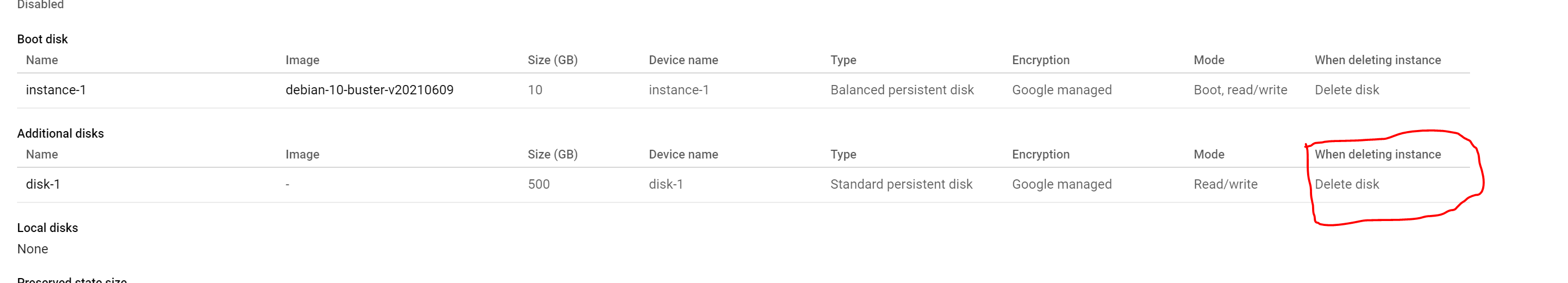 如果告诉Terraform删除实例,但不删除磁盘,并且启用了自动删除,那么它不会专门删除磁盘,但是GCP仍然会删除它们。这种行为不会在计划运行中显示,因此可能导致不必要的结果,以及仍然显示磁盘存在的状态。