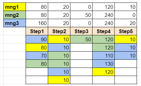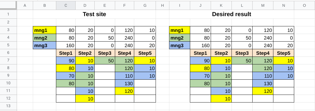 }在我看来,映射函数可以在这里使用。首先获取值、和颜色的数组。然后,从颜色数组中,为这三种颜色中的每一种得到3个数组(带有0和1)。然后将这些数组乘以一个值数组,将元素添加到3行中的每一行的5个单元格中。理论上,我理解,但实际上.我寻求帮助。