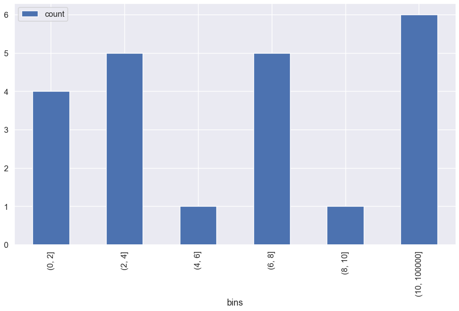 bins = pd.IntervalIndex.from_tuples([(0, 2), (2, 4), (4, 6), (6, 8), (8,10), (10, 100000)])