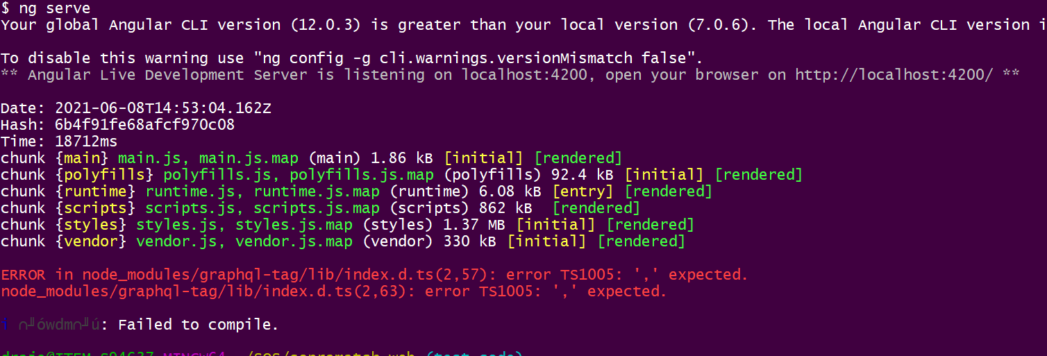 错误:',‘预期。node_modules/graphql-tag/lib/index.d.ts(2,63):错误TS1005:',‘预期。I∩╜ówdm∩╜ú:编译失败。