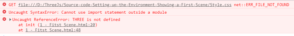 我已经从它的官方站点下载了three.js,我尝试运行非常基本的文件,我遇到了奇怪的错误,但是当我用CDN替换three.js文件导入时,它就开始工作了。请帮助我从本地启动文件。