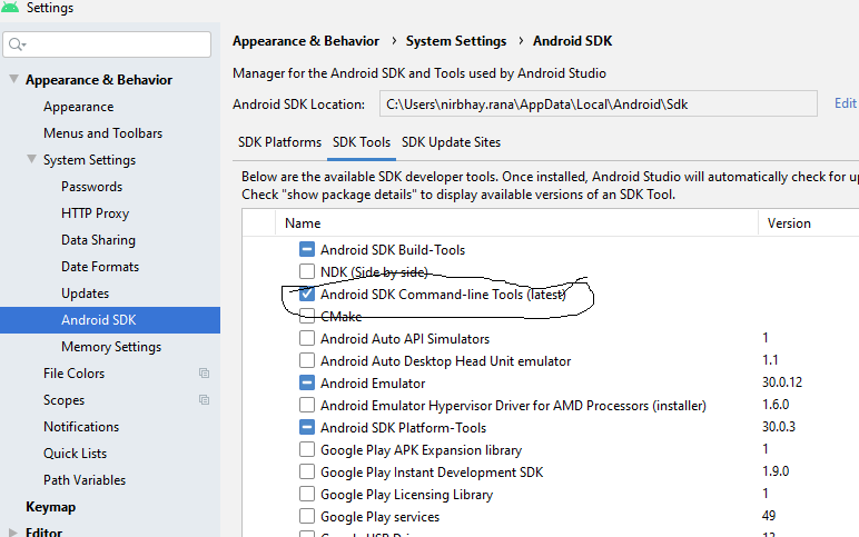 安装Android命令行工具应该可以解决这个问题。导航到设置、外观和行为->系统设置-> Android
