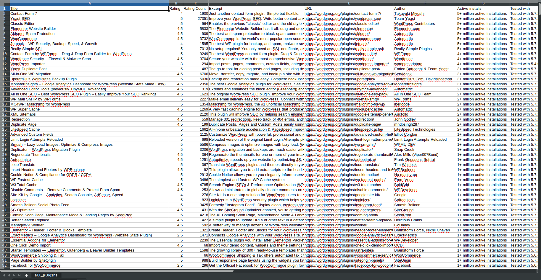 df.to_csv("all_plugins.csv", index=False)它会抓取所有页面(目前共有49页),并将所有内容转储到.csv文件中,其中包含980行(截至目前),如下所示: