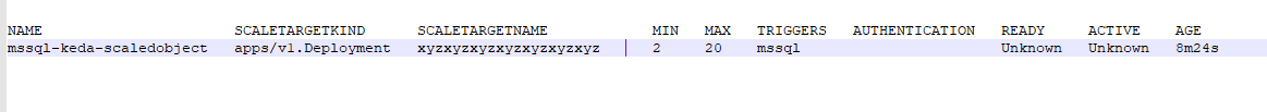 我在我的k8s集群中使用keda进行自动标度。在使用MSSQL触发器部署我的缩放对象之后,我将准备好并将活动状态作为未知状态。在日志中,我只看到它试图创建一个HPA,然后什么也没有发生。我猜keda-接线员被困在这里,因为我在日志上没有得到任何更新。
