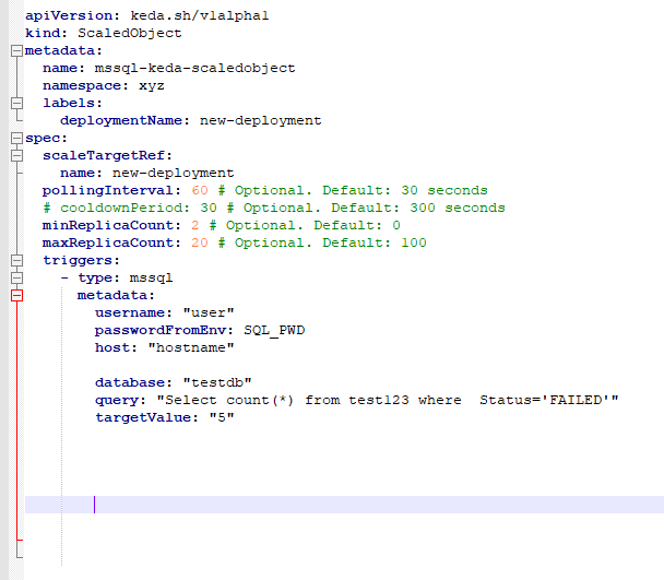 kubectl describe scaledobject <your-scaled-object-name> 最终,我的问题需要安装正确版本的KEDA,还需要修改MSSQL连接字符串。