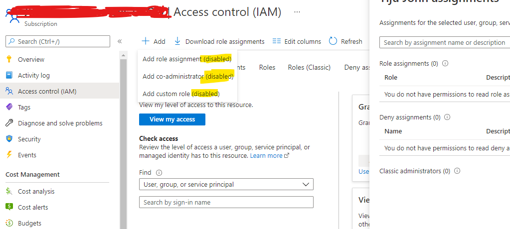 当我导航到订阅下的访问控制刀片时,我看到已禁用添加角色分配选项。