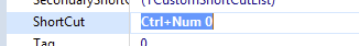 如果我试图在IDE (Ctrl+Num 0)中直接在ShortCut属性中设置值,就会得到错误:“无效属性值”。如果我双击快捷方式属性,然后按"Ctrl“和"Numkey 0",它将在热键编辑中显示"Ctrl+Num 0”,当我按enter时,它在Shortcut字段中显示"Ctrl+Ins“。