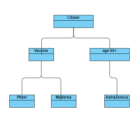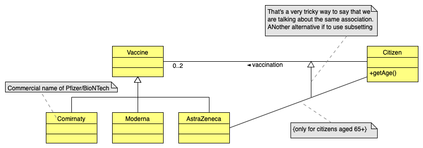 Pfizer BioNTech,Moderna和AstraZeneca分别是一个Vaccine:您应该从特定的疫苗推广到普通的Vaccine来展示这一点。age 65+似乎不是一个好的类的候选对象:在大多数面向对象语言中,类的一个对象在它的整个生命周期中都会保持这个类。但是,65岁的公民不会换课。年龄是Citizen的一个(派生)属性。此外,“阿斯利康疫苗不能给65岁以上的人接种”的措辞也是一种限制。。