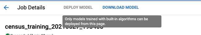 现在,我可以在控制台中选择下载模型,如下所示(但不能部署它,因为“只有经过内置算法培训的模型才能从这个页面部署”)。所以,我点击下载。