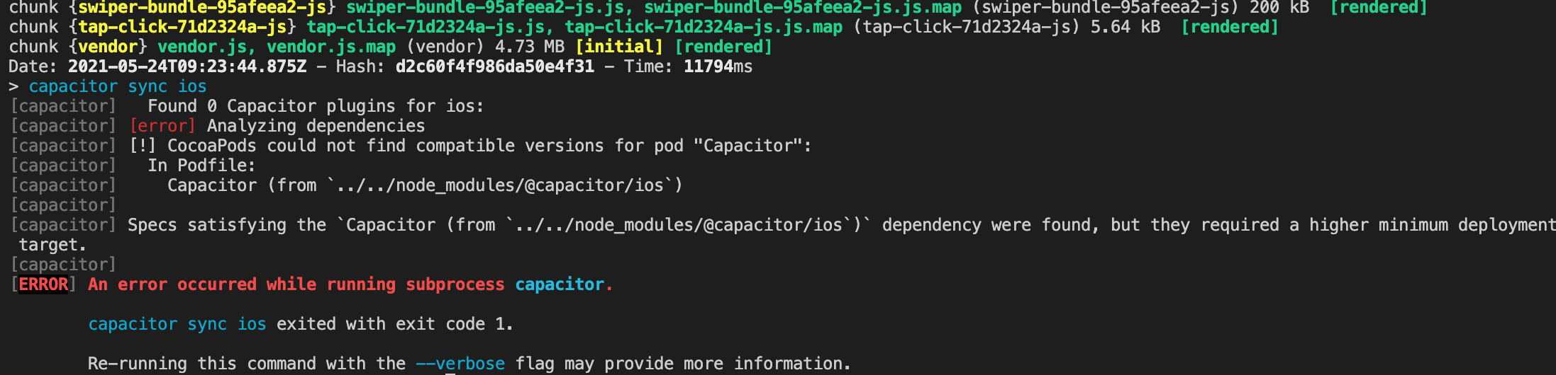 本机项目与您的依赖项不同步。npx cap run ios不会同步您的项目,它只会复制代码更改.