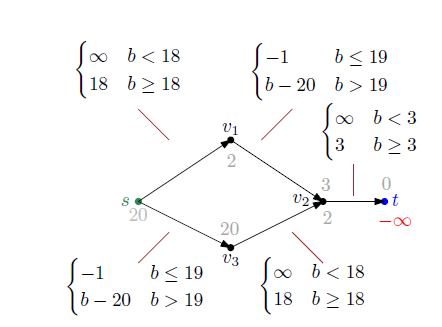 编辑2:最大电池负载为20,这解释了为什么电池负荷在s和v_3之间没有增加,以及为什么不可能通过s->v3->v2达到t。