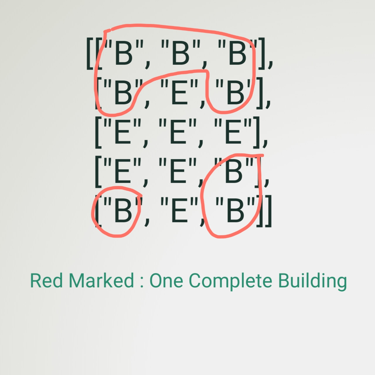 想象一下,你是作为土地测量师为地方政府工作的。这是你的工作,以了解有多少空间,有多大的空间,在城市现有的工业用地,新建的建筑物。为了达到这个目的,你需要测量现在有多少座建筑物。工业站点由一个2D数组表示,其中"B“表示(建筑物的一部分),"E”表示一个空空间。如果B是水平或垂直连接到其他B的,那么这些B是一个建筑物的一部分。如果两个B只是对角线连接,就把它们看作是单独的建筑物。编写一个函数: find_building( input_map ),它返回工业站点上的建筑物数量。如果数组中的任何元素不是"B“或"E",则函数应该返回-1。注意:编辑器中的初始代码使用制表符进行缩进。别把它和空间混在一起。示例:以下示例中有三栋建筑物: