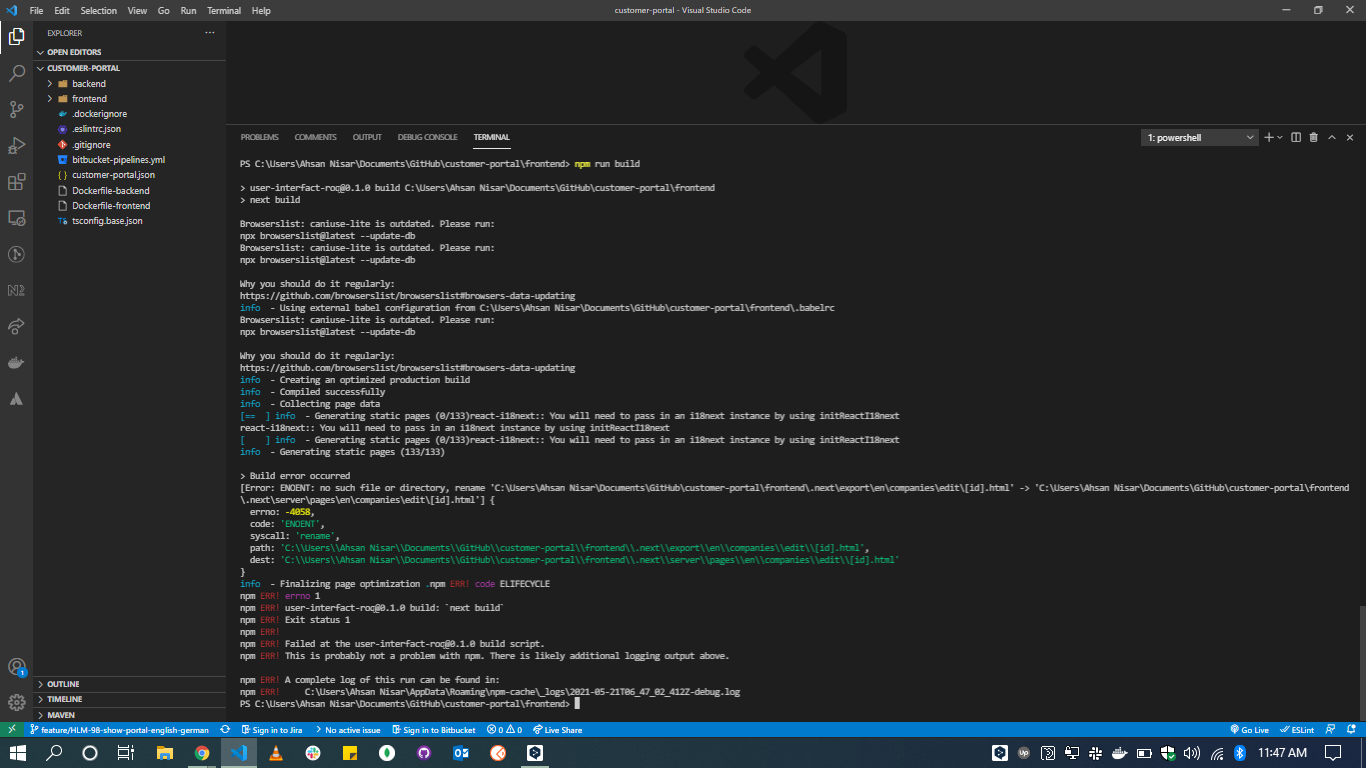 [错误: ENOENT:没有这样的文件或目录,重命名C:\Users\Ahsan Nisar\Documents\GitHub\customer-portal\frontend.next\export\en\companies\editid.html‘-> 'C:\Users\Ahsan Nisar\Documents\GitHub\customer-portal\frontend.next\server\pages\en\companies\editid.html']