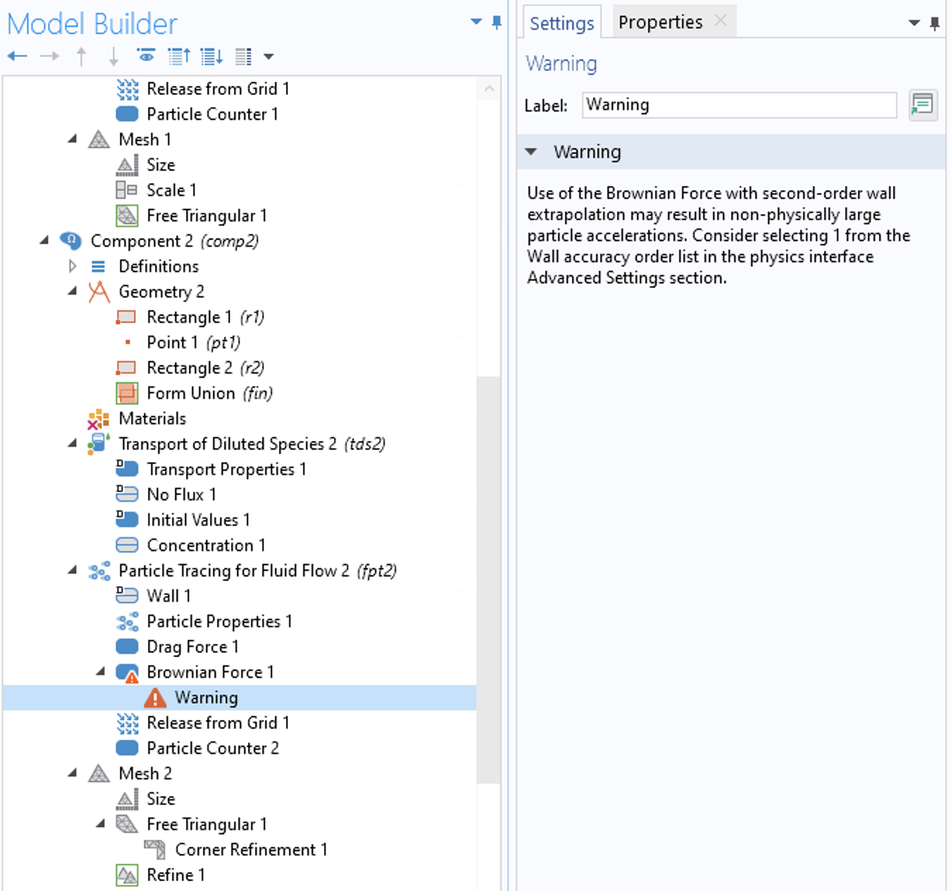 我想在我的COMSOL模拟中添加一个布朗力。不幸的是,我得到的警告如下所示,我不知道如何摆脱它。