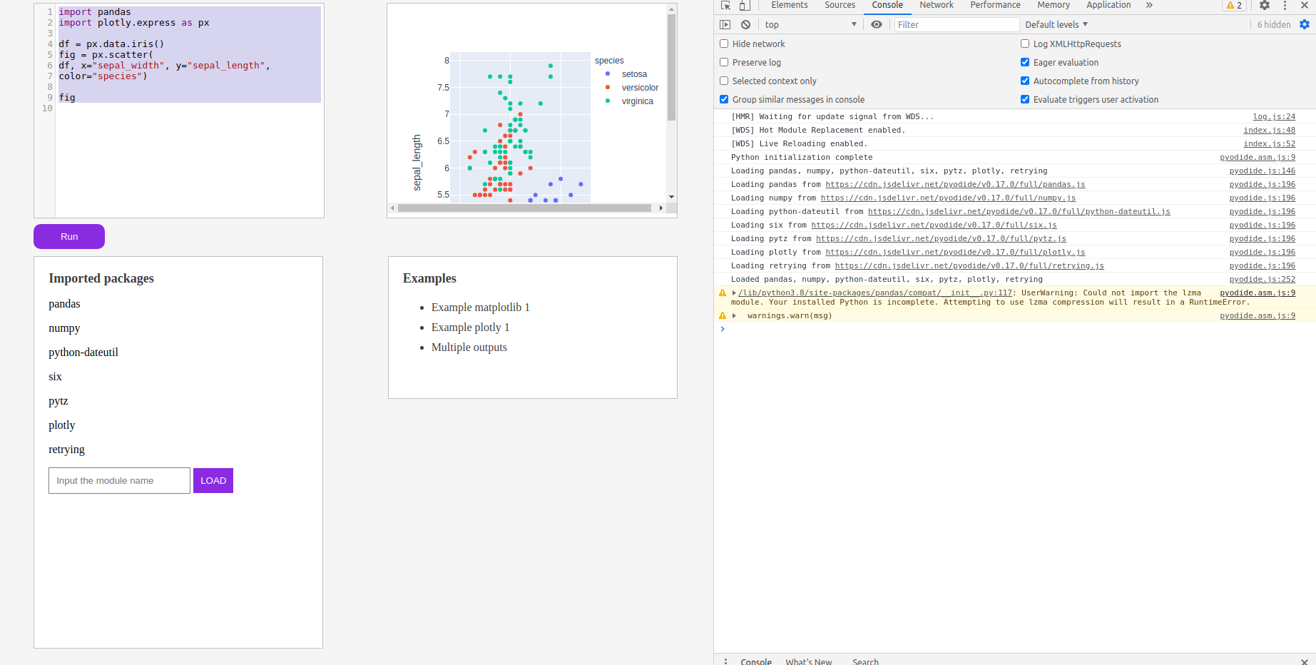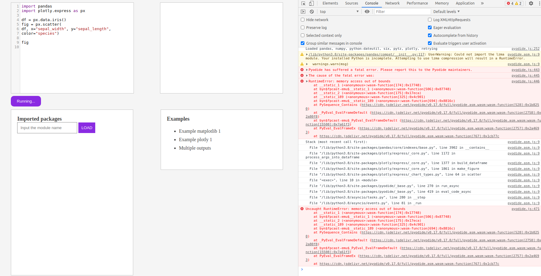 问题是,当我使用pyodide运行代码片段并打开控制台时,会正常工作: