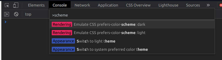 当前配置(tailwind.config.js)本质上依赖于页面顶部的切换按钮,因为darkMode: 'class'的存在。如果您将其设置为media,您可以在系统中切换它,也可以转到Chrome和ctrl + shift + p,并选择您的任意prefers-color-scheme进行测试。