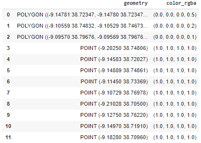 我的Geopandas DataFrame有3个多边形和9个用matplotlib.colors.to_rgba函数计算的color_rgba列的点: