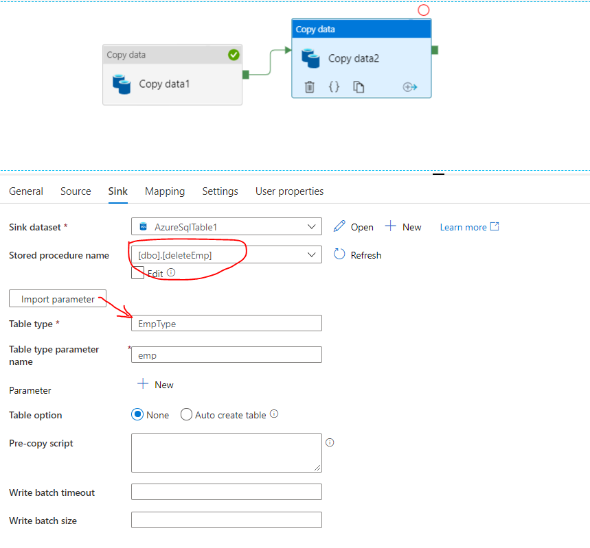 --DELETE;Copy activity1将行复制到Azure中。选择存储的prcedure并单击Import parameter。
