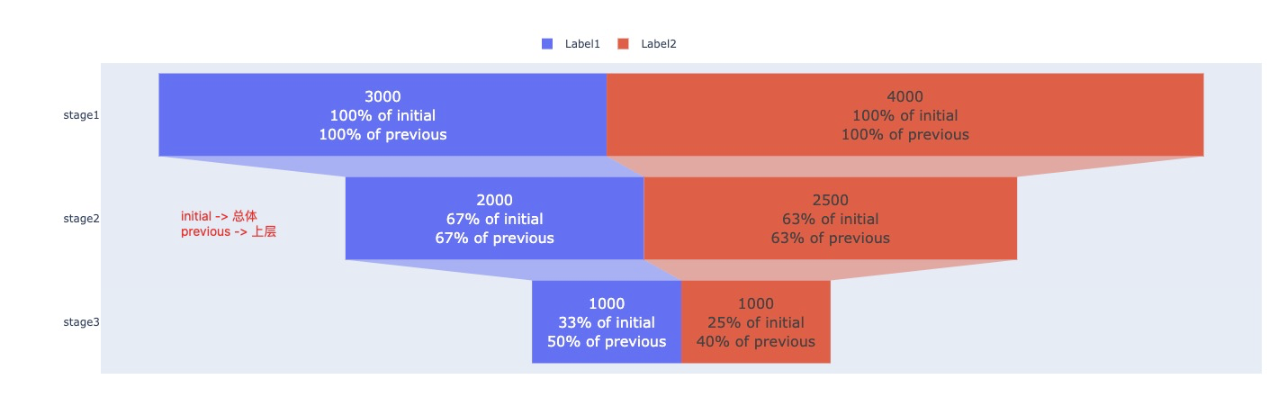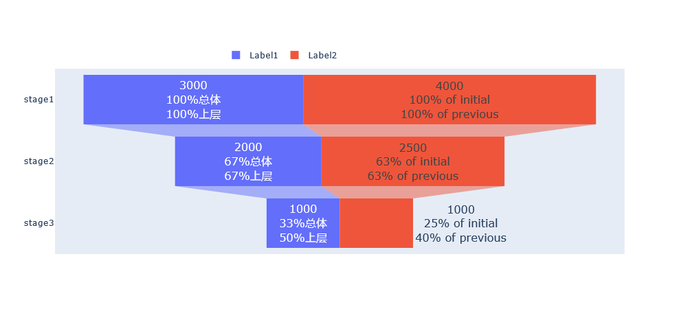 在我的漏斗图中,我想将textinfo注释更改为我的客户语言(中文).To更具体,我想将“初始值”改为"总体",将“前文”更改为"上层“。另外,我也想改变内部值的格式,例如"3000“到"3千”。有什么办法吗?非常感谢!