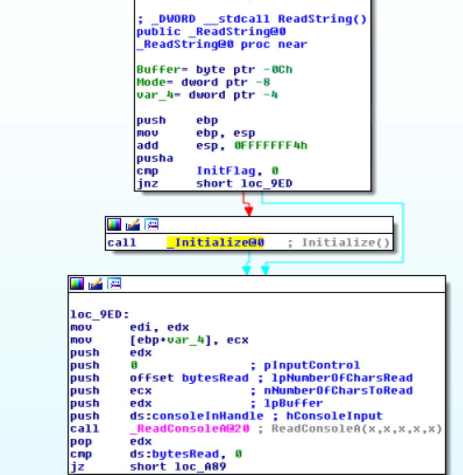 ReadString在内部使用ReadConsoleA,使用Windows为控制台子系统自动创建的可执行控制台(即使用GetStdHandle检索控制台输入和输出句柄)。