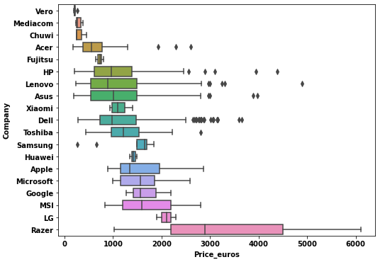 sns.boxplot(data=dftrain, x='Price_euros', y='Company', order=mean_index)