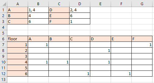 对于每个单元格的更改,您都希望更新顶部的表,以显示用该类别字母标记的逗号分隔的行号列表。您可以使用只监视数据输入单元格的change事件,然后逐列遍历所有数据行。如果当前单元格的值为1,则将行的楼层号附加到顶部的汇总表中。