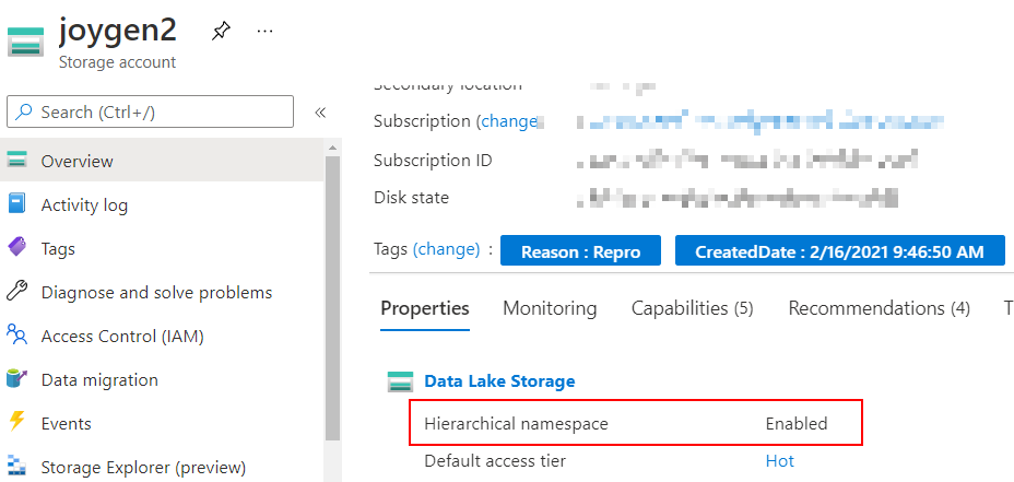 我可以在我这边复制您的问题,我想您的存储帐户是一个数据湖存储Gen2帐户,即启用Hierarchical namespace,如下所示。