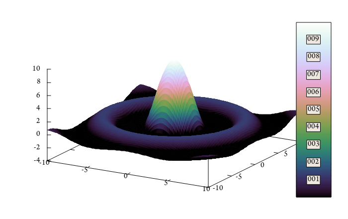 f(x,y) = 10*sinc(sqrt(x*x + y*y))