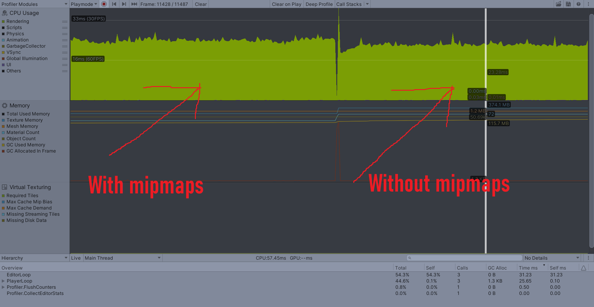 您的mipmap不是解决性能问题的方法。它们只会降低离目标更远的纹理分辨率。性能上的差异是存在的,但这不是你所期望的。