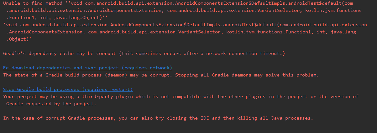 无法找到方法'void com.android.build.api.extension.AndroidComponentsExtension$DefaultImpls.androidTest$default(com.android.build.api.extension.AndroidComponentsExtension,com.android.build.api.extension.VariantSelector,kotlin.jvm.functions.Function1,int,java.lang.Object) '‘void com.android.build.api.extension.AndroidComponentsExtension$DefaultImpls.androidTest$default(com.android.build.api.extension.AndroidComponentsExtension,com.android.build.api.extension.VariantSelector,kotlin.jvm.functions.Function1,int,java.lang.Object’