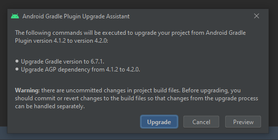 几个小时前,我已经将我的Android升级到4.2版本,而现在,当我打开我的一个旧项目时,我收到了一条来自Android的消息,要我将Gradle版本升级到6.7.1。在我这么做之后,我收到了一条错误信息,我不能再构建我的项目了.我也尝试过从Android提供解决方案,但没有成功。有什么帮助吗?