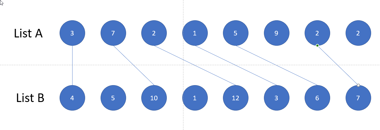 ListMatcher matcher = new ListMatcher(new int[]{3,7,2,1,5,9,2,2},new int[]{4,5,10,1,12,3,6,7});