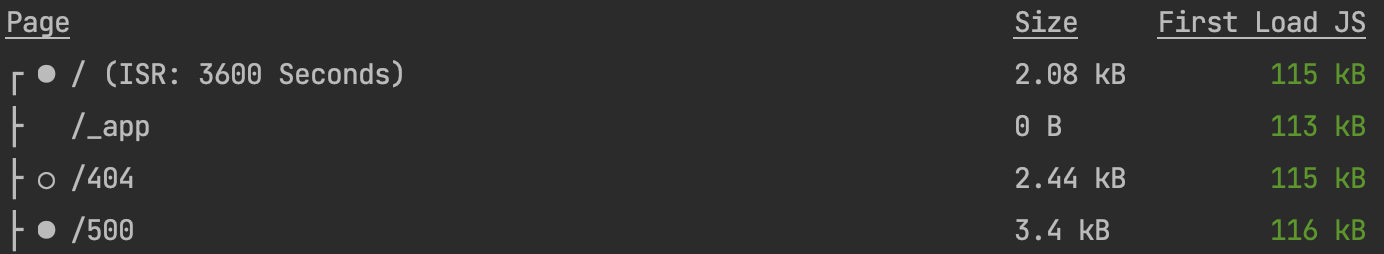 有趣的是,如果您在本地检查.next目录的内容,您将注意到使用GetStaticProps的所有页面都具有静态生成的.json和.html文件。使用GetStaticProps和revalidate的页面返回=== Incremental Static Regeneration或ISR。ISR是SSG和SSR的理想混合体,具有扫描生产中传入的更改/更新的后台函数(您指定的数字是在可能的更新之间以秒为单位的时间量)。因此,使用GetStaticProps + ISR的页面在.next目录中生成三种文件类型-- .html、.json和.js。也就是说,使用GetServerSideProps或GetInitialProps的页面只在.next目录中生成.js文件。最后,没有使用上述任何方法的纯Static页面只生成.html文件。
