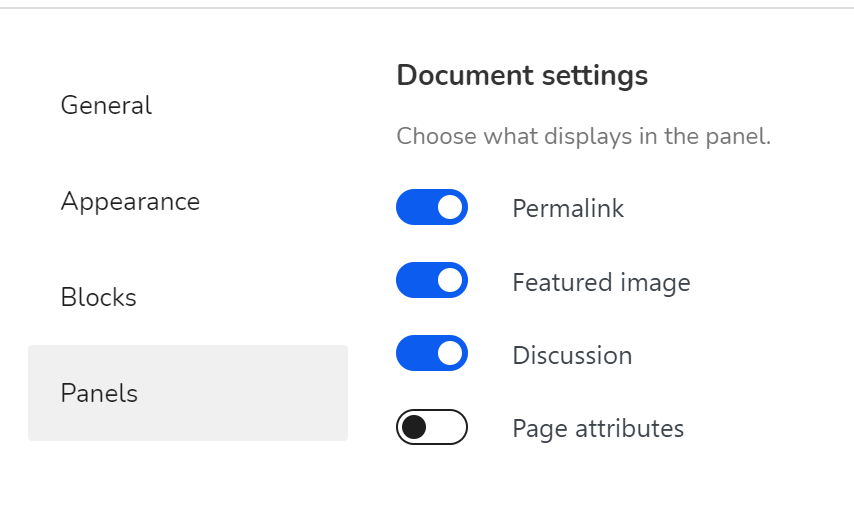 我正在寻找一种方法来隐藏一些页面设置面板在Gutenberg编辑器侧边栏基于用户角色。由于这些面板标题没有特定的类,所以我无法使用CSS来针对它们,所以我想知道是否有一种方法至少可以控制哪些面板在首选项中处于活动状态: