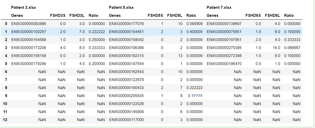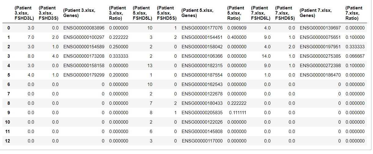 我遍历了一个excel文件文件夹,将它们转换为dataframes,并将这些数据文件放入字典中,其中键是文件名。我想要做的是在文件名不重要的地方制作这个大数据,因为我需要的数据的列名是唯一的。我想合并‘基因’列,因为他们重复,填充NaN分数w/零,并删除‘比率’栏。