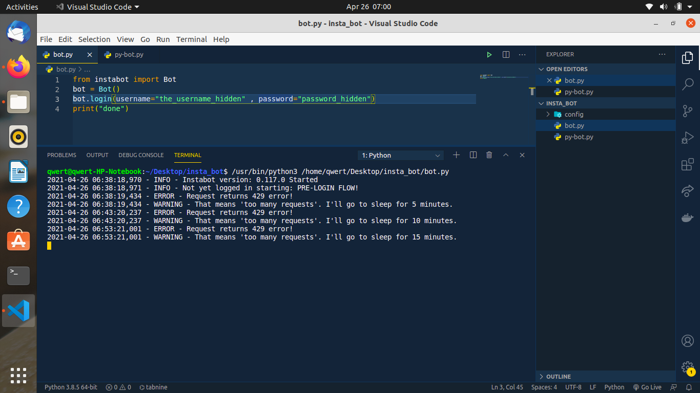 2021-04-26 06:38:18,970 - INFO - Instabot version: 0.117.0 Started